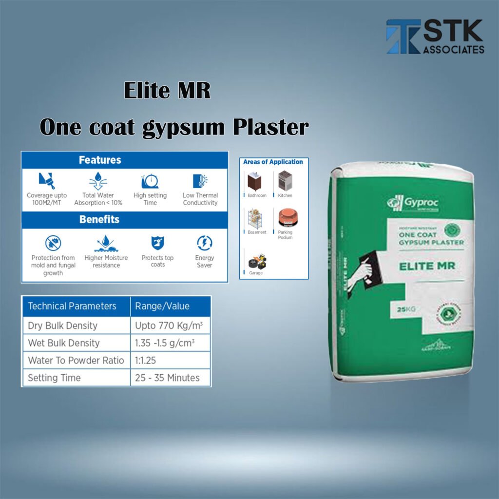 Gyproc Elite MR (Moisture Resistant) is a one coat gypsum plaster specifically designed to provide protection in wet areas like bathroom, kitchens, basement, garages, balconies, parking podium etc. It provides extra protection with low absorption of moisture in air or from surface giving excellent results in skirting area application with problems arising out of capillary action and efflorescence. It can be directly used over backgrounds like bricks, blocks, RCC etc. and provides a smooth inert, high-quality surface to internal walls and ceilings and a durable base for application of decorative finishes.